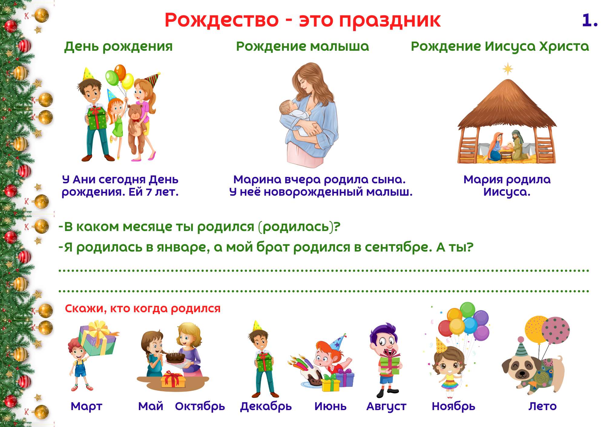 9 страниц рабочих листов по теме РОЖДЕСТВО: когда, кто и как отмечает, что такое ПОСТ, СОЧЕЛЬНИК, КАЛЯДКИ, ГАДАНИЕ. Повторяем Винительный падеж, описание картин, составление рассказа по картинкам. Рассчитано на 1-2 урока.